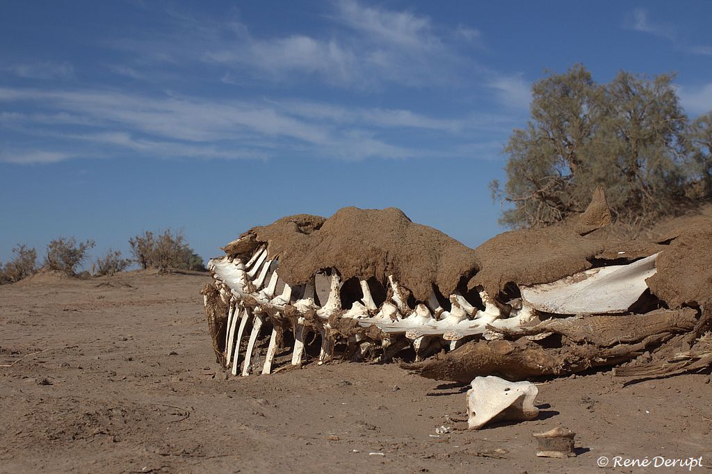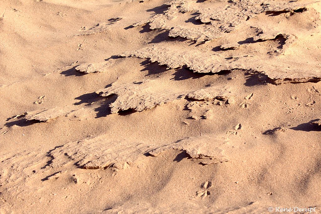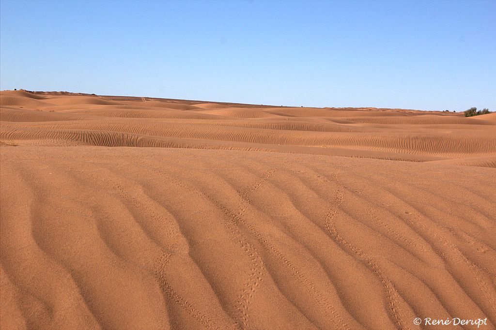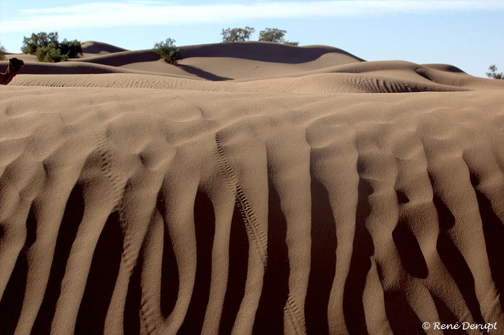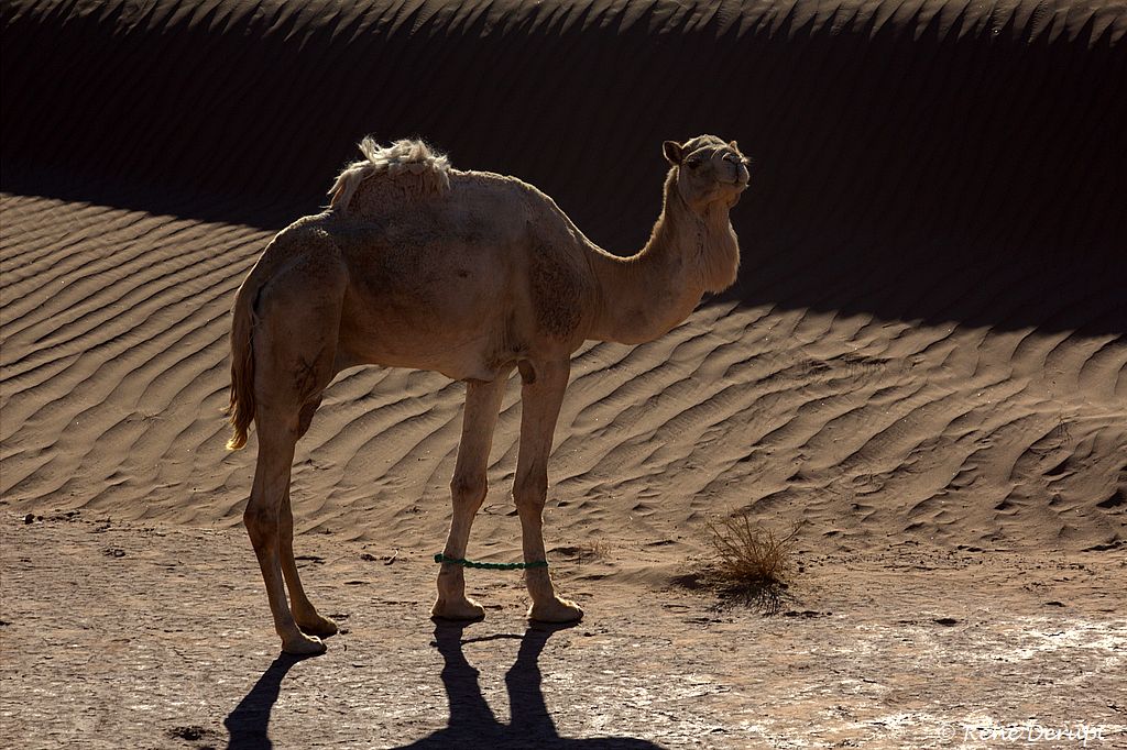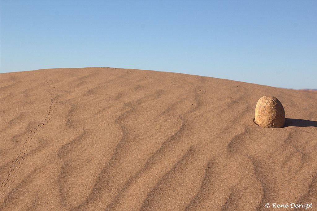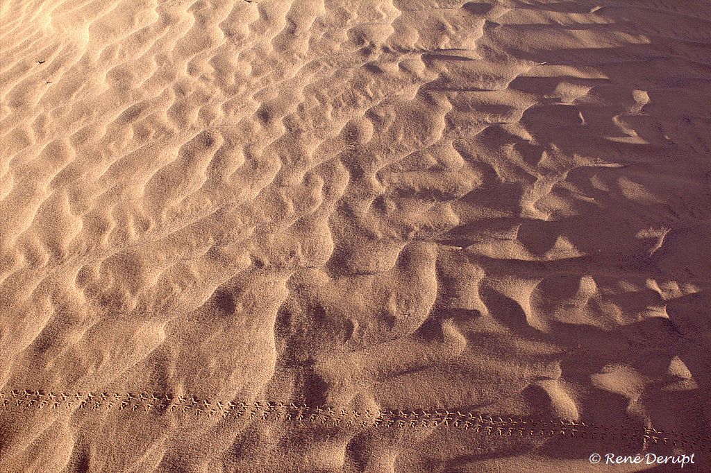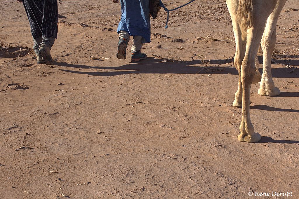Pendant le voyage, l’immobile et le silence de l’environnement sont rois. Seul les humains en transit avec les fidèles dromadaires, véritables partenaires de survivance, sont en mouvement.. Il est rare de voir des êtres vivants habitants ces contrées hostiles. Seul leurs traces sur le sable sont présentes pour souligner l’existence de créatures vivants sur le sable chaud et aride.